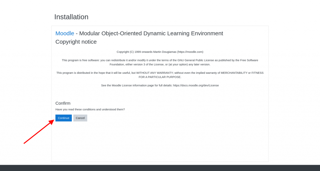 The application will review the details and if they are correct you will be forwarded to the next step which is related to the Terms of Service of the Moodle Software and if you agree with them you should click on the “Continue” button: