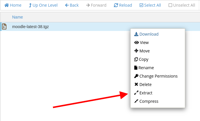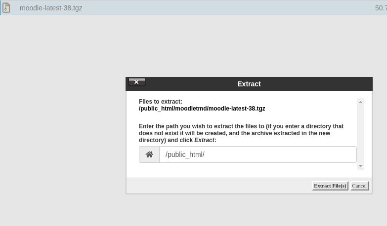 Once you click on the files you will be asked if you wish the files to be directly extracted to the current directory of the archive file or you wish to extract them to a subdirectory. We recommend extracting the files to a subdirectory only if you wish your Moodle application to load from a subdirectory of your domain. If you wish the files to be extracted to your domain you should have the following screen: