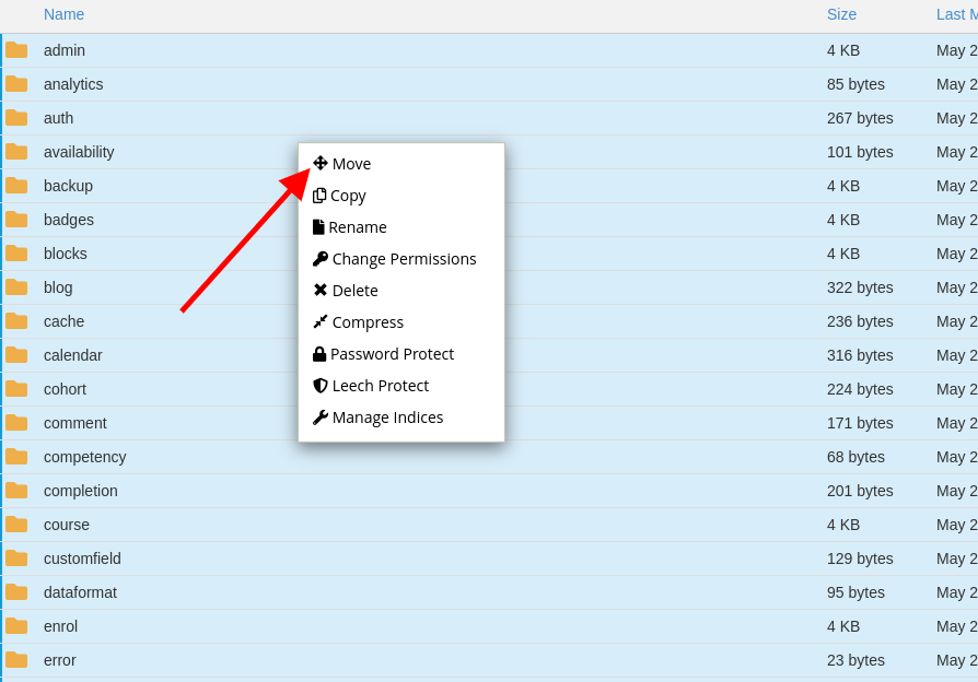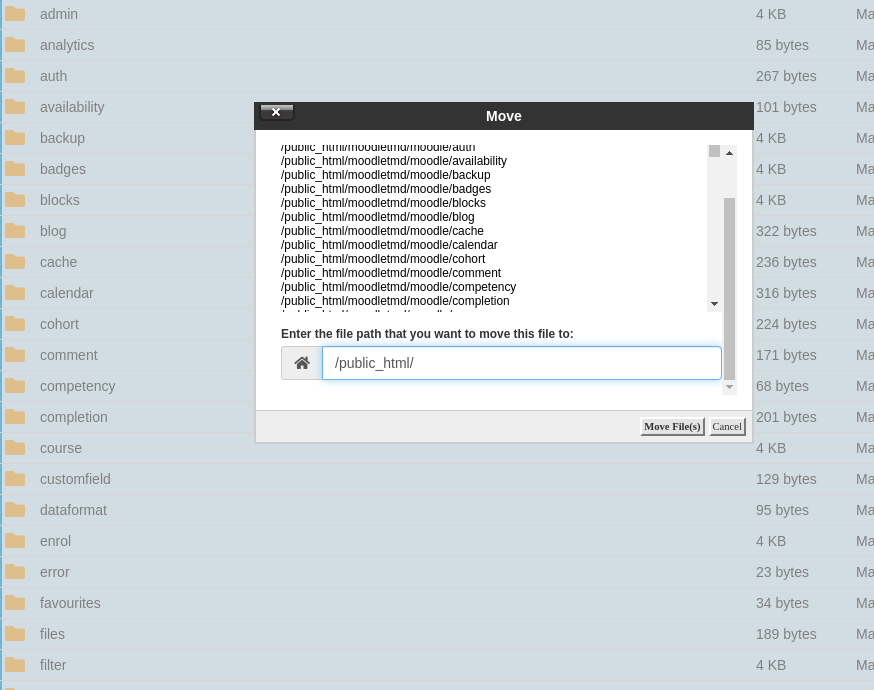 If you do not wish your Moodle application to load from the subdirectory “moodle” you should move the files from it to the public_html directory. You could do that by accessing the moodle directory and selecting all files with your mouse from which the result will be as follow:
