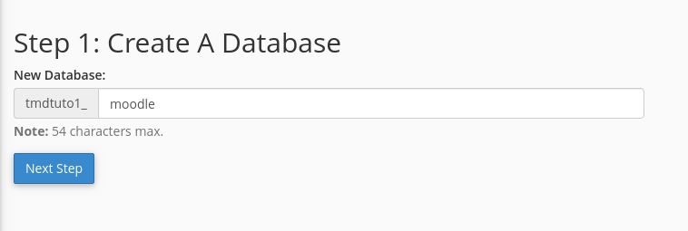 Once you click on the “Next Step” button your database will be successfully created and you could use it during the installation of your Moodle application.