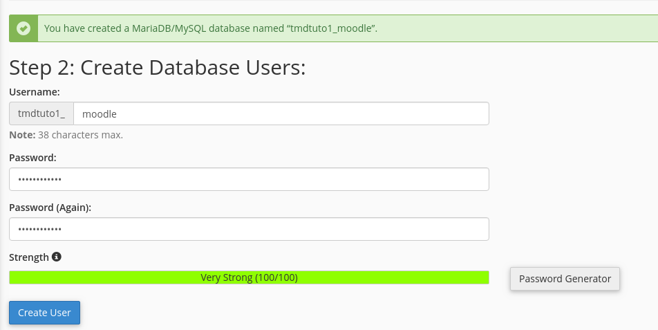 In the second step you will be asked to create the Database user which will be associated with your Moodle application. We recommend the database user to have the same name as the database name so you could easily manage them in the future. Also we would recommend copying the database name and password to a secure file. You will need them later during the installation process: