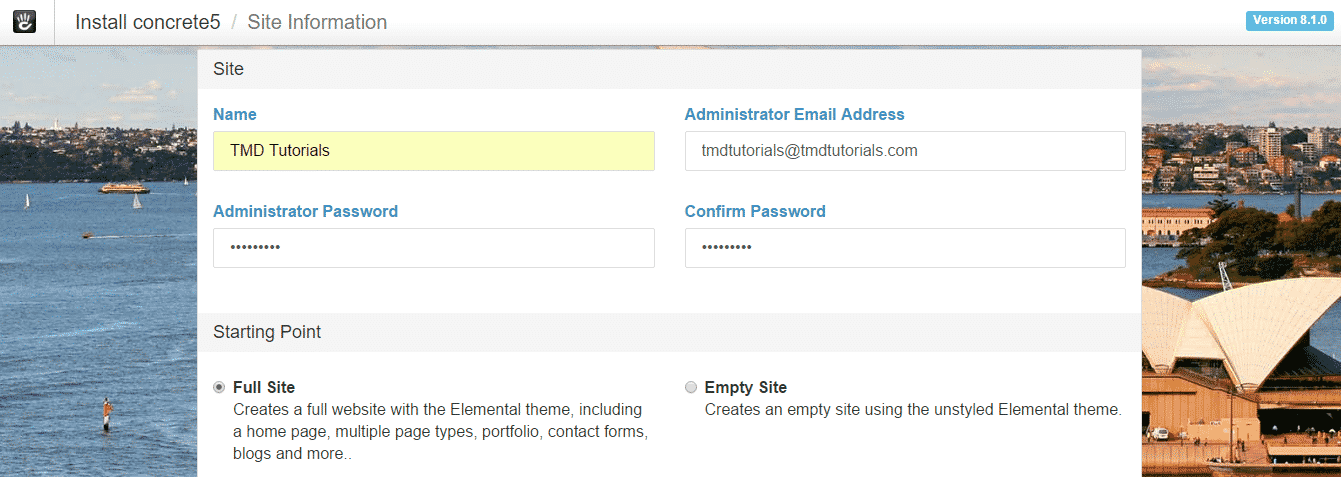 Finally, you will see the installation page. There, in the Site section, you will be able to set the administrator name, password and email address:
