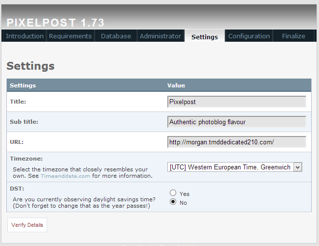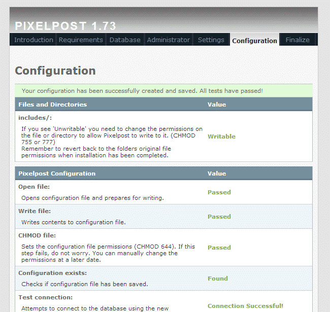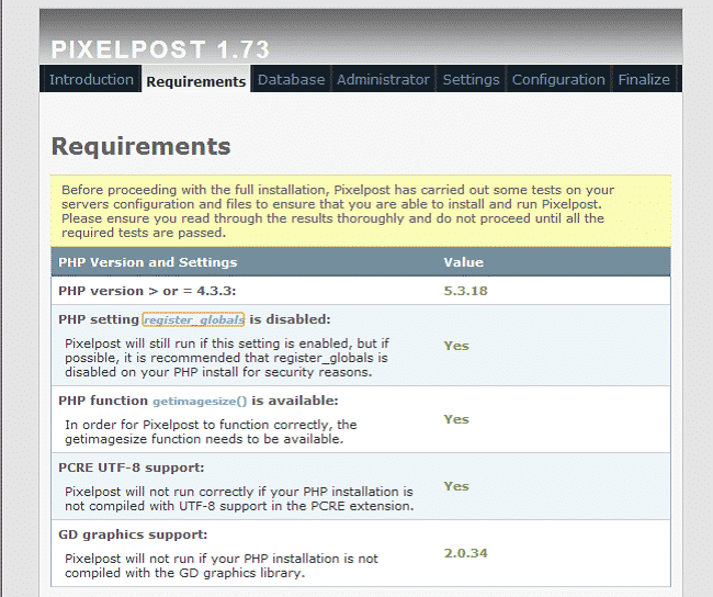 Proceed to the next step. PixelPost will make sure that all server requirements to run the script are met: