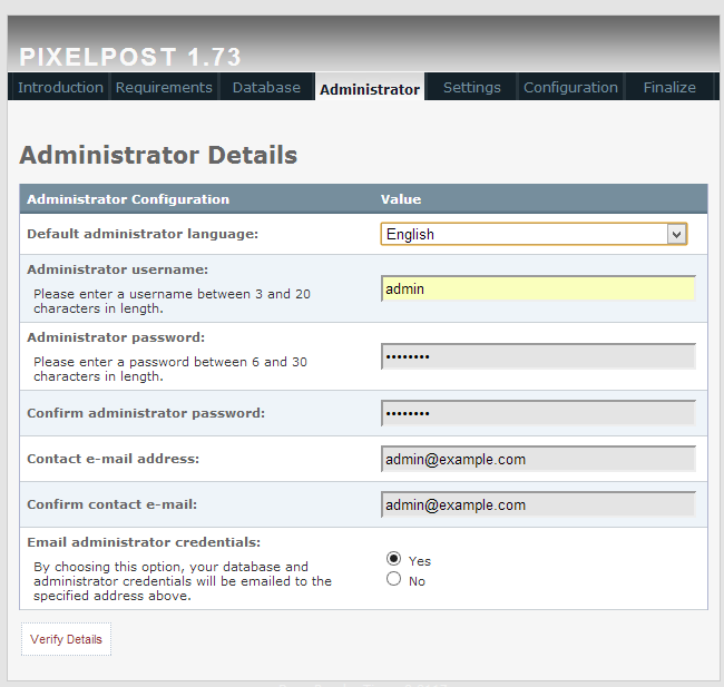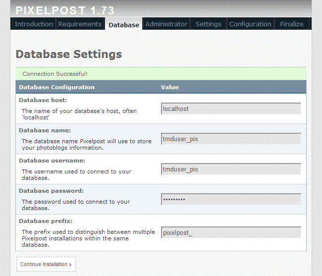 When you have filled in all the data, test the connection by clicking the “Test Connection”. Once the script has indicated that the connection is successful, click on the “Continue Installation” button. On the next page setup your administrative account: