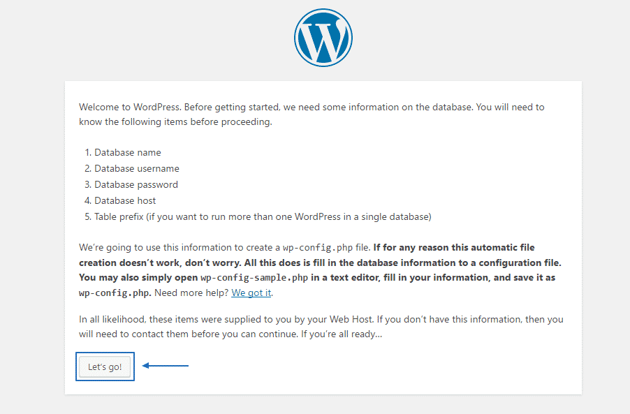 WordPress will now provide you with some brief information about the setup process. Simply click on the Let’s go! button to continue: