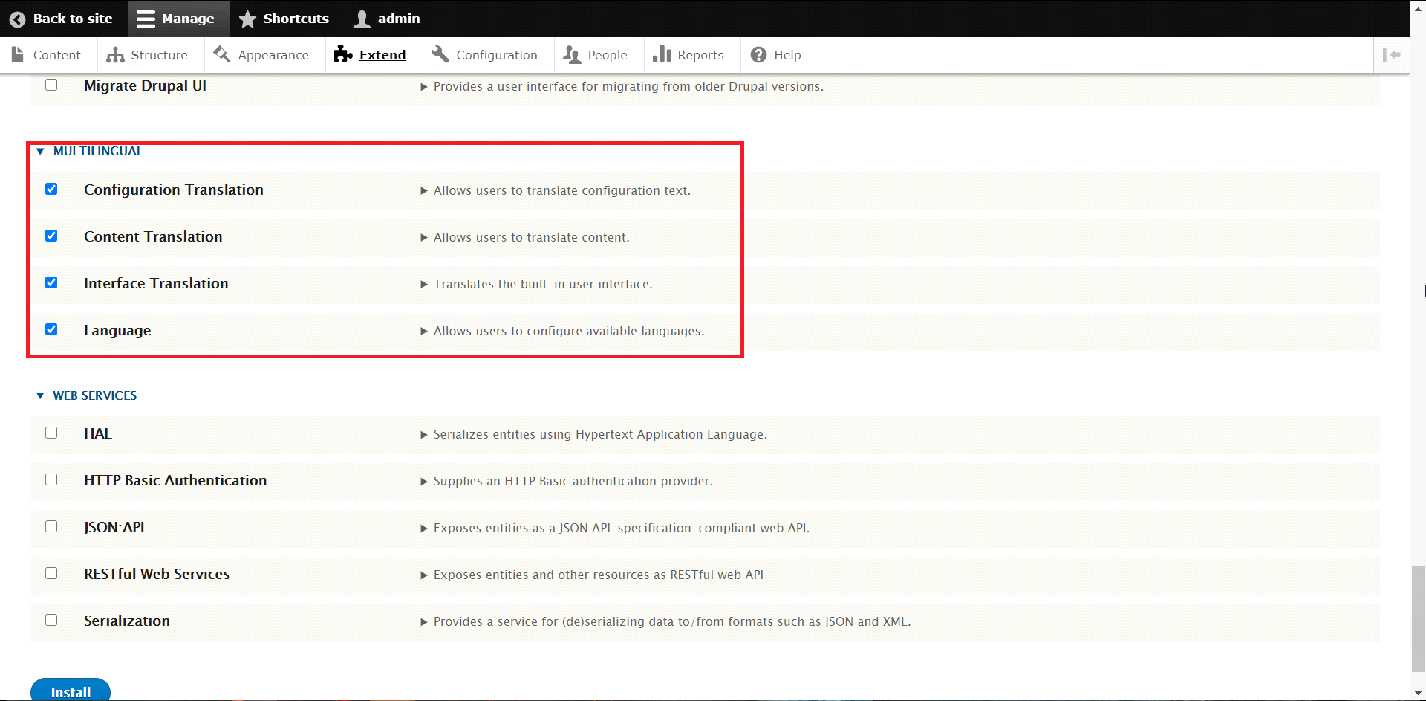 In the "Extend" panel, scroll down to the bottom of the page until you find the "Multilingual" section.