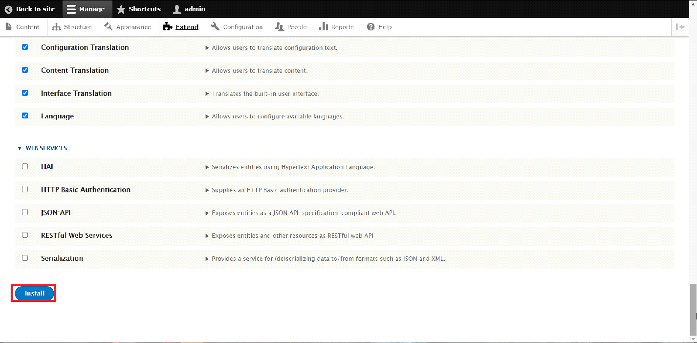 Upon selecting the desired modules, you may proceed with the installation process by clicking on the "Install" button at the bottom of the page.