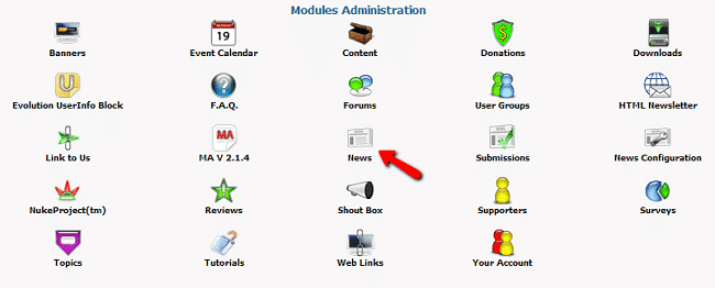 Nuke Evolution Xtreme comes with its own News module which you can use to add and manage articles on your site. We are going to show you how to configure the module and add a simple article in this tutorial. The first thing you will need to do is login to the admin area of your site. Find the News module under “Modules Administration”: