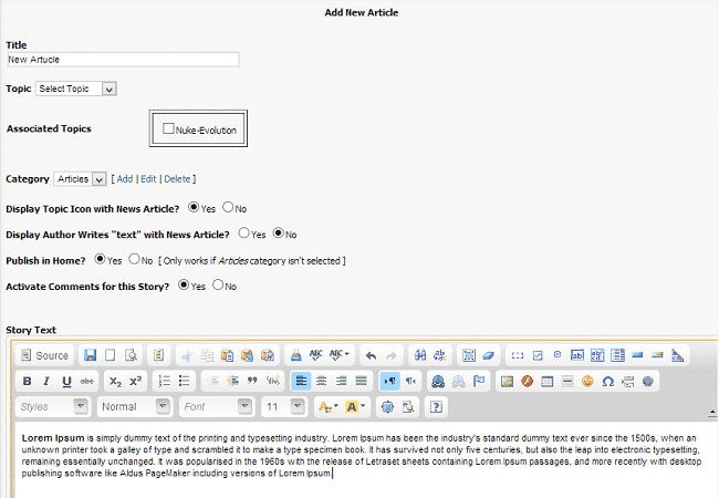 On the next page you can manage and edit existing articles. For the purpose of this tutorial we are going to add a new one. You can customize your new content by setting: