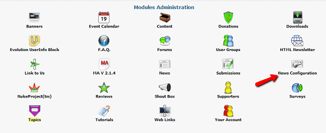Now we will show you how to configure the News page. Go back to the main page of your administration area. Find the News Configuration icon under “Modules Administration”