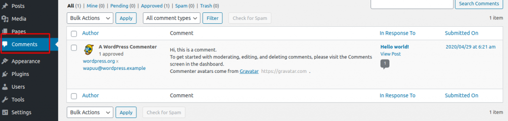 The comments on the WordPress websites can be managed easily from the admin area → Comments