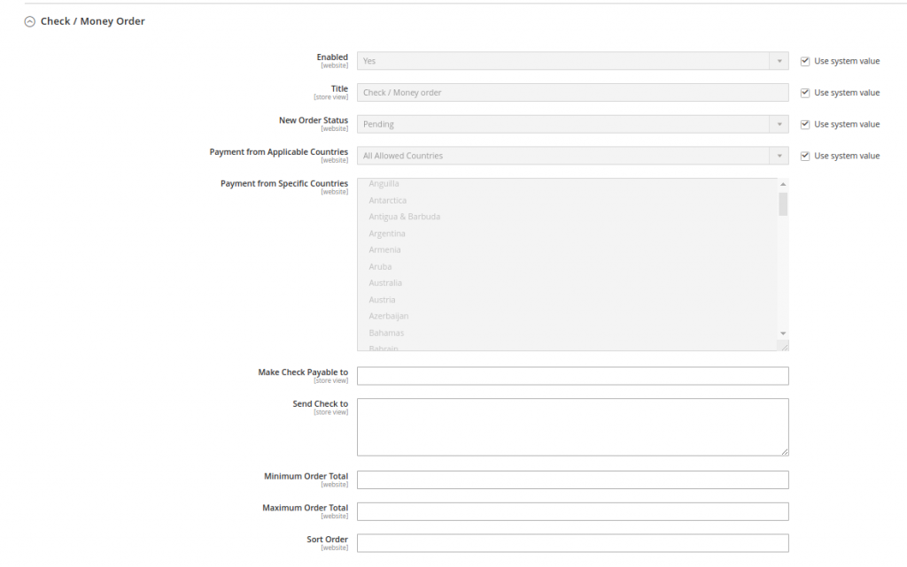 Check / Money Order – This is the other Offline Payment Method that Magento Supports. In this case, the customer will provide you with a check or a bank statement for the sum of the order that he is about to make. The downside of this payment method is that you would need to verify the payment by contacting the specific bank from which the check or statement is signed on your side. You can find the available options that you have when selecting this Payment Method: