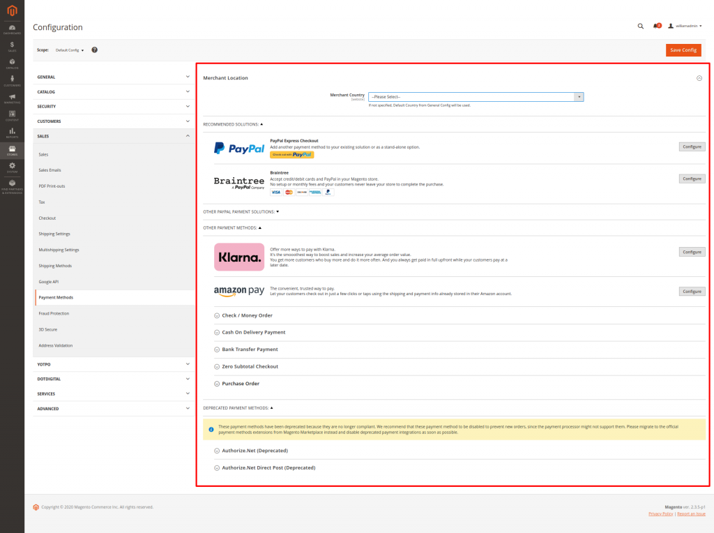 Now moving forward to the Online Payment Options, Magento gives you access to configure many of the most common online payment gateways, such as PayPal, Braintee, Klarna, Amazon Pay, Bank Transfer Payment, Zero Subtotal Checkout.