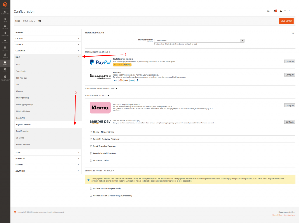 After that you would need to go to Sales (1) > Payment Methods (2) as described in the next screenshot: