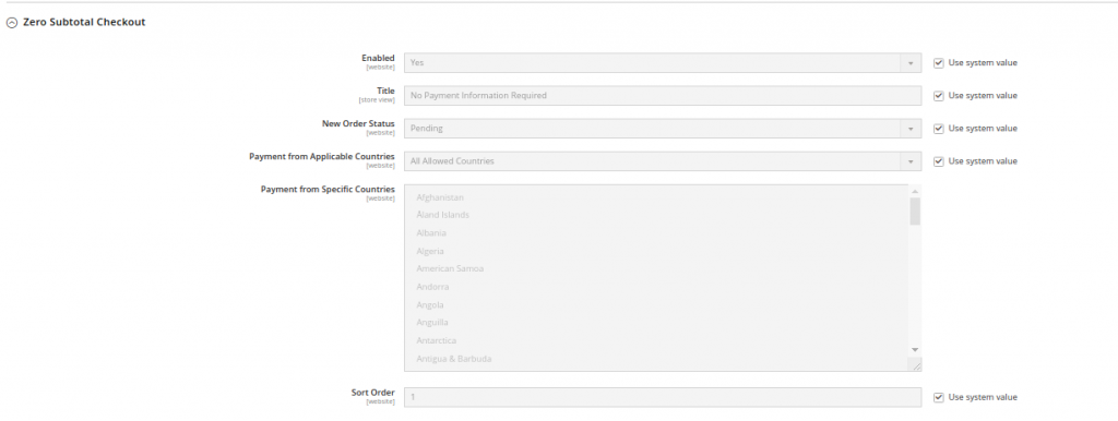 And finally, we will cover the Zero Sub-Total Checkout Payment Method – This is an option that can be used on products which value equals zero. This can happen if your Customer has a special Coupon or a Discount Code that completely covers the price of the product that he has ordered. Here you can find a screenshot of the available options: