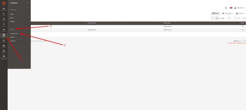 Once the files have been uploaded, you would need to access your Magento Admin Area Dashboard and navigate to Content (1) > Design (2) > Configuration (3) as described in the following screenshot: