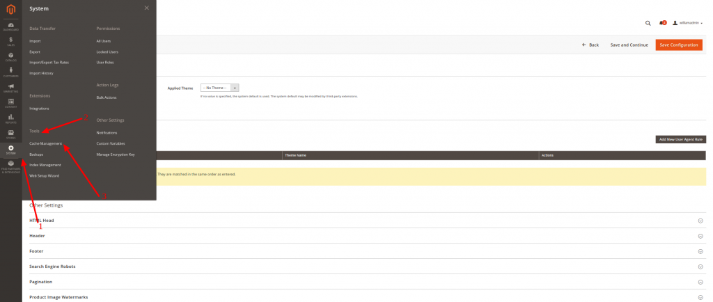 Once you have selected your new Theme, it is possible that the changes have not immediately reflected, due to the Page Cache that Magento has by default, therefore, it is also best to clear your application Cache by navigating to System (1) > Tools (2) > Cache Management (3):