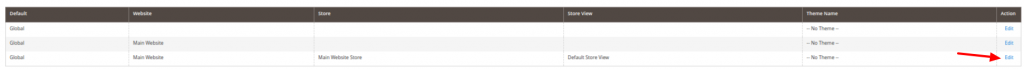 Once you are there, you would need to click on the “Edit” Button Right next to the Magento Store that you wish to apply the theme on. If you have a Magento MultiStore configuration, you will see all of your available Stores in this Menu, if you have a singular Main Store you will only see the entry for it here. You can see the “Edit” button on the screenshot below: