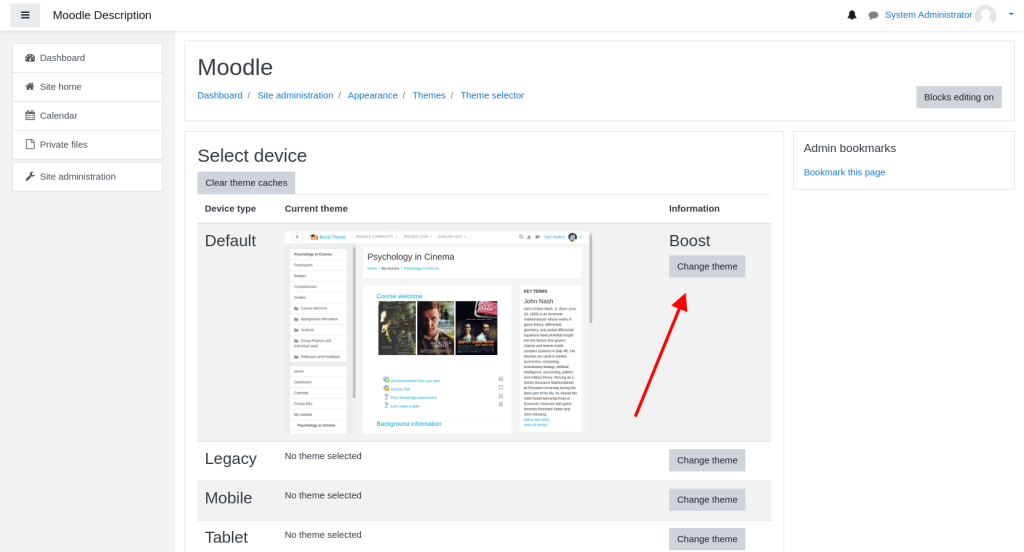 By clicking on the Change theme button the Moodle application will provide you with all themes which are present in the “themes” directory of your Moodle document root. In our case currently there are only two themes from which you could choose: