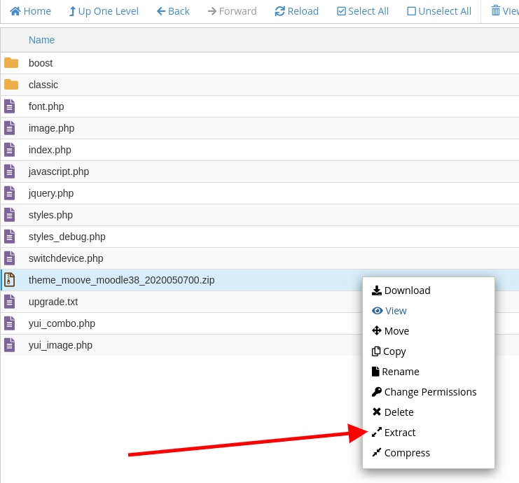 Now when you are in the theme directory you will see the theme archive file uploaded to it. Next you should extract the files of the archive in the theme directory:
