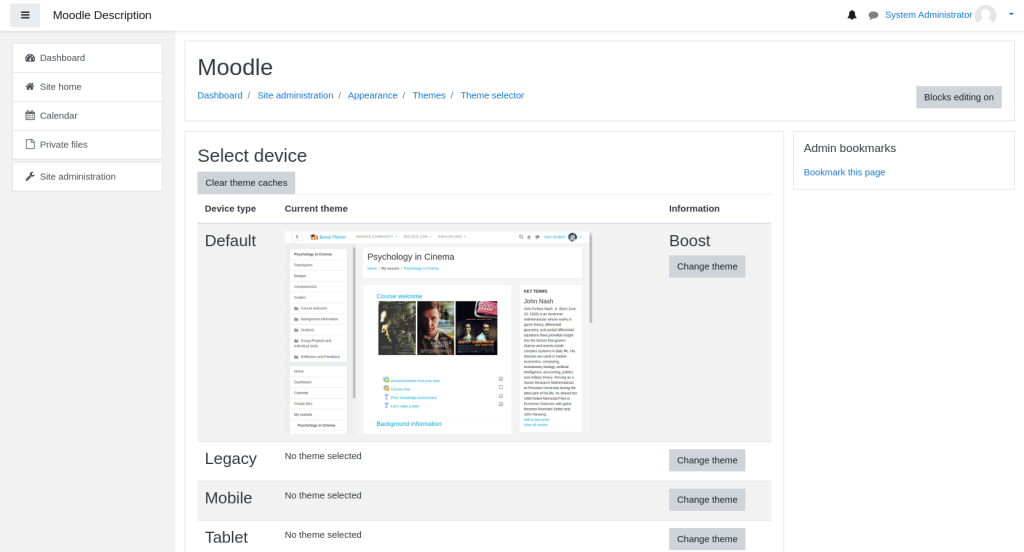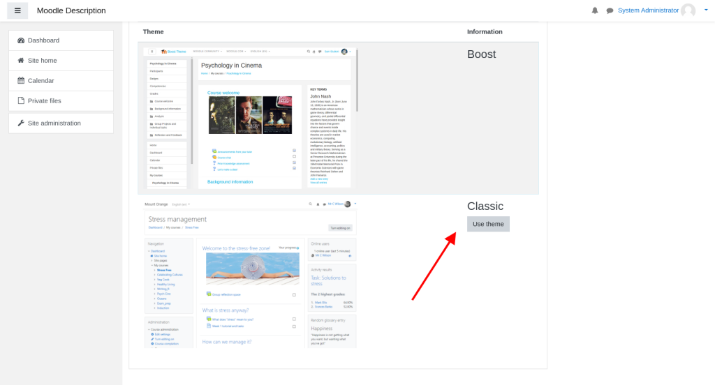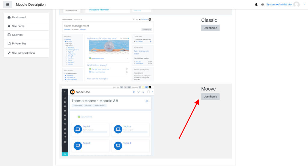 When the theme is installed successfully you will be able to select it from the Theme Selector page of your Moodle application: