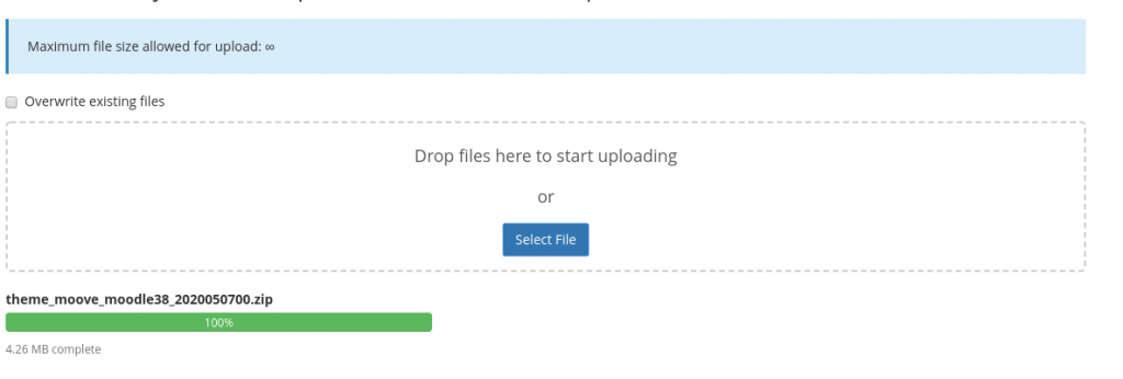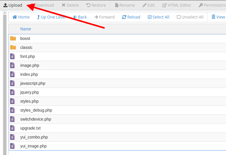 Once in the theme directory of your Moodle application click on the Upload button and select the theme archive file to upload it to the directory: