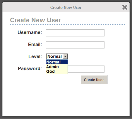You should fill in the fields in the form and select the user level. The highest level is the “God” user. If you have accounts set with this username they will have access to all the functions of your Pligg website. The second level is “Admin” – the admin user has limited administration access compared to the “God”. The lowest level is “Normal”. This is the level which will be set for all the new account registrations on your website.