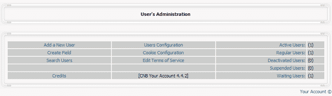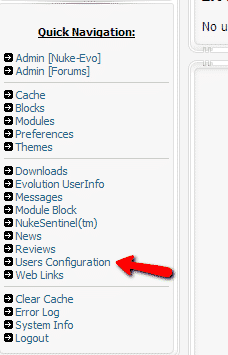 Nuke Evolution Xtreme comes with its own user configuration section in the admin area, which can come in very handy for managing your website users. To enter the control panel go to your site’s admin area and select “Users Configuration” from the left side menu:
