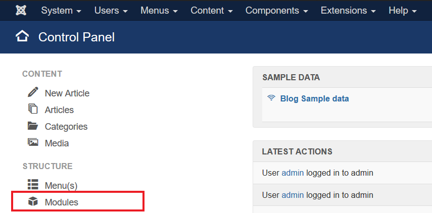 Once logged into your Joomla administrator’s dashboard you may find your Modules from the menu located on the left hand side of the home page.