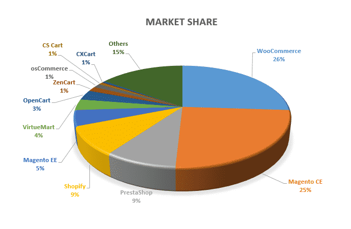 Many customers that need to develop an online store are prone to build it using the WooCommerce plugin. To depict its share among the overall usage of e-commerce platforms we have made a research and here are the results: