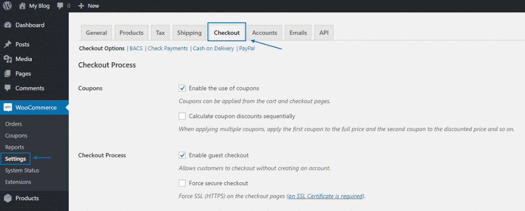 To proceed with the configuration you should first access your WordPress dashboard and navigate to WooCommerce > Settings > Checkout Section: