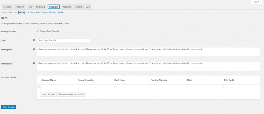 The first payment method in our example is the BACS: