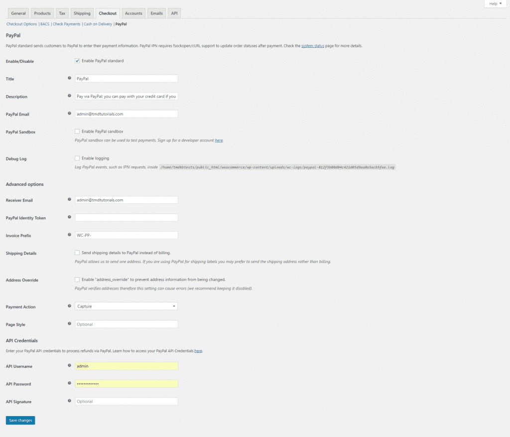 Debug Log – if this option is enabled the PayPal events will be saved in a file inside your hosting account.